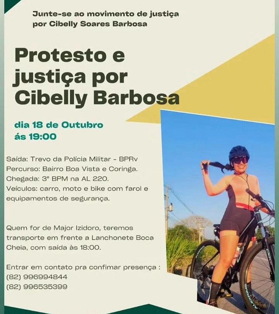 Familiares estão organizando um protesto na busca por justiça em relação a morte da policial militar Cibelly Barbos, que foi atropelada por uma caminhonete no último sábado (14), enquanto praticava ciclismo em um trecho da AL-220, na zona rural de Arapiraca.