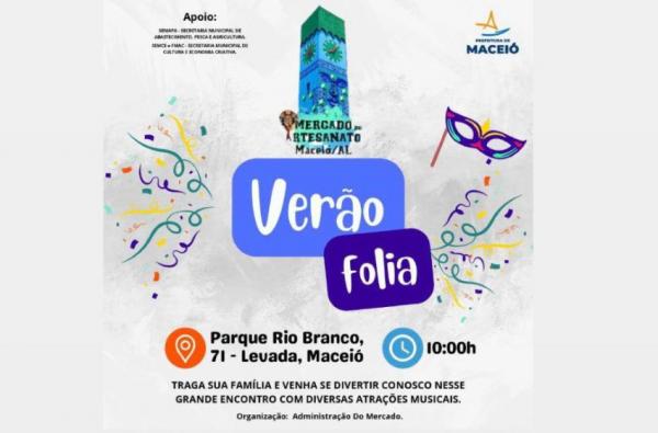 No próximo sábado (13), às 10h, acontece o Verão Folia, no Mercado do Artesanato, no bairro Levada, em Maceió. O evento é organizado pela Secretaria Municipal de Abastecimento, Pesca e Agricultura (Semapa).